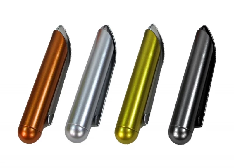 The capsules are made of plastic with a screw top and a metal clip.